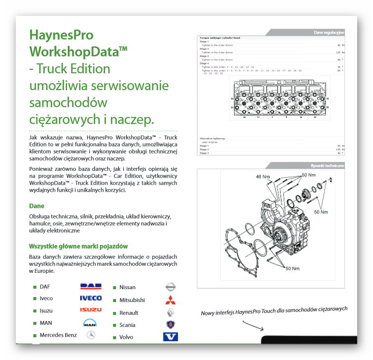 Baza danych HaynesPro Truck Edition zawiera szczegółowe informacje o pojazdach wszystkich najważniejszych marek samochodów ciężarowych w Europie. DAF Iveco Isuzu MAN Mercedes Benz Nissan Mitsubishi Renault Scania Volvo 3 Instrukcje napraw Częstotliwość obsługi serwisowej Normy czasowe napraw
