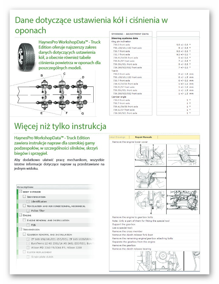Dane dotyczące ustawienia kół i ciśnienia w oponach HaynesPro WorkshopData - Truck Edition oferuje najszerszy zakres danych dotyczących ustawienia kół, a obecnie również tabele ciśnienia powietrza w oponach dla poszczególnych modeli. Więcej niż tylko instrukcja HaynesPro WorkshopData - Truck Edition zawiera instrukcje napraw dla szerokiej gamy podzespołów, w szczególności silników, skrzyń biegów i sprzęgieł. Aby dodatkowo ułatwić pracę mechanikom, wszystkie istotne informacje dotyczące napraw są przedstawiane na jednym widoku.
